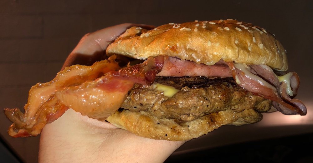 1/2 pound ground round char-grilled with bacon, ham, swiss and american cheese